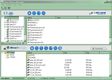 Жизненно необходимой для использования программой является iRiver Music Manager, похожий на другие менеджеры данного класса плееров, как две капли воды: может записывать все, что угодно в память плеера и извлекать оттуда все, кроме музыкальных файлов, упорядочивать последовательность проигрывания, стирать файлы с плеера. Отличие только одно, но существенное: программа умеет манипулировать с каталогами целиком. Связано это с тем, что плеер имеет полноценную поддержку каталогов, унаследованную от MP3/CD-плееров компании. С одной стороны, это куда более правильный подход, чем единственный каталог в большинстве моделей, разворачивающаяся в линейную структура каталогов в DIVA/MusicPen/PhotoClip или несколько предопределенных каталогов в iAudio, с другой же с учетом относительно небольшого объема памяти в моделях линейки, полноценная древовидная файловая система нужна почти всем iFP как рыбке зонтик.