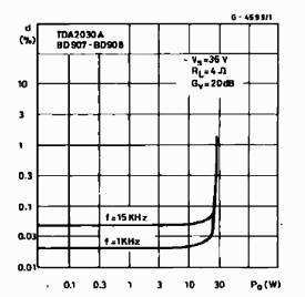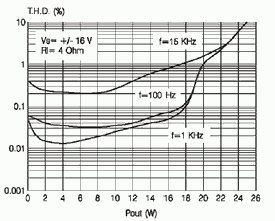 Нашим постоянным читателям эта микросхема хорошо известна высокими показателями мощности при значении коэффициента гармоник на уровне качественной Hi-Fi аппаратуры (0,02 % на 1 кГц). При измеренном напряжении питания ±19 В приведенный график можно рассматривать без корректировки значений по оси мощности.