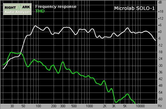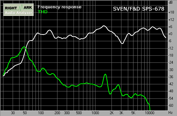 Неравномерность AЧХ находится в пределах ±4 дБ, а это уже показатель, характерный для Hi-Fi колонок. Следует отметить достаточно равномерную кривую от 70 Гц до 18 кГц, при этом уровень искажений можно считать вполне приемлемым.
