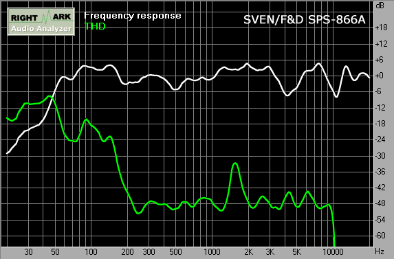 SPS-866A — несомненный «чемпион» по неравномерности и искажениям на низких частотах. Только в области средних частот АЧХ остаётся более или менее на уровне. В верхах преобладают резкие скачки амплитуды.