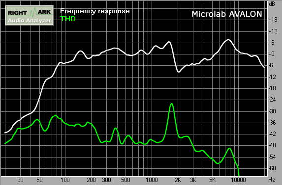 Да, в области средних частот АЧХ несколько лучше. Басы начинаются с 60-70 Гц, однако сопровождается это неприемлемо высоким уровнем искажений (10-30%!). В районе 3 кГц также наблюдается провал на стыке рабочих частотных диапазонов двух динамиков — среднечастотного и высокочастотного. Искажений немного меньше, но в самом начале до 80 Гц творится что-то страшное. Во время теста вместо низких частот колонка воспроизводит какие-то хрипы и бульканье. AVALON не воссоздает такие низкие частоты, но, возможно, это и к лучшему. :)