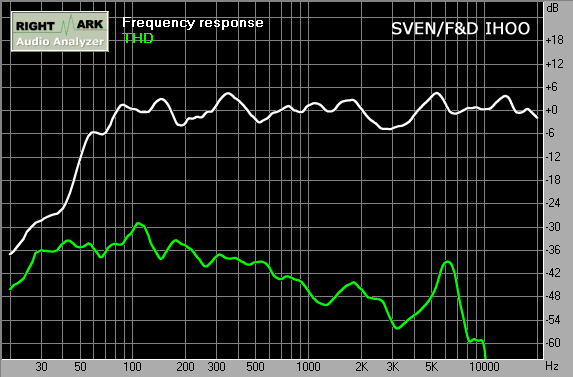 Взглянем на график фронтальных колонок очень удачного набора IHOO. АЧХ неплохо выглядит на протяжении от 60Гц до 20 кГц, но пик искажений на 6 кГц портит всю картину. Впрочем, график КНИ подтверждает наши слуховые тесты. Это как раз та самая дешёвая пищалка с резиновым диффузором, которая портит звучание всей колонки.