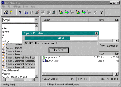 Ну что же, запишем mp3 файлы и послушаем, как звучит MPMan. Операцию записи файлов в память MPMan можно произвести с помощью простой и интуитивной функции drug'n'drop, т.е. просто выделяем нужные файлы и перетаскиваем их мышкой в нужную область памяти MPMan.
