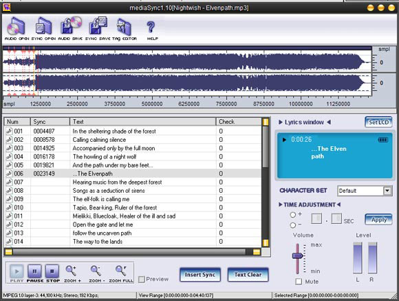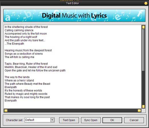 Кроме MusicFriend на CD можно найти, уже упоминавшуюся выше, программу mediaSync, при помощи которой вы сможете заставить плеер выводить на экран тексты ваших любимых песен, синхронизировано с мелодией. Открываем файл c музыкой, после чего нам предлагают ввести текст песни, либо загрузить его из текстового файла: