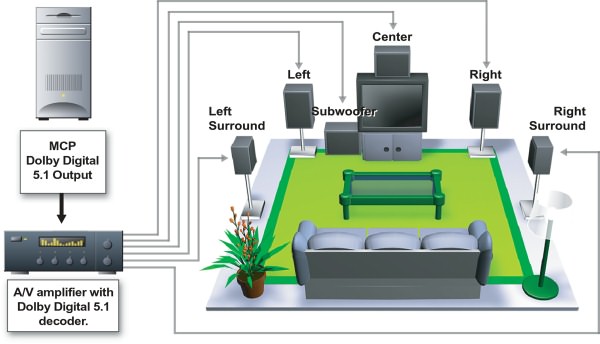 Цифровой выход заслуживает отдельного разговора. Так как nForce разрабатывался для использования в игровой приставке X-Box от Microsoft, это наложило свой отпечаток на его повышенную функциональность. С распространением домашних кинотеатров у многих в гостиной стоит комплект 5.1-акустики и бытовой AV-ресивер. Последний представляет из себя декодер и 5-канальный усилитель. Привычные пользователям PC многоканальные аналоговые входы встречаются на таких устройствах довольно редко. Обычно имеется лишь несколько цифровых входов и несколько аналоговых стерео-входов. Передать многоканальную информацию в рамках стандартного S/PDIF протокола в несжатом виде нельзя, максимум что получится — это один стереопоток. Таким образом, для получения полноценного многоканального звука в играх необходимо кодировать сигнал на лету в какой-нибудь формат со сжатием, например в Dolby Digital 5.1.