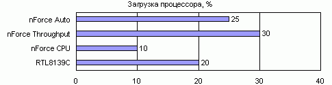 Как видно из результатов, сетевой контроллер чипсета nForce вполне конкурентоспособен в своем классе. По загрузке процессора и скорости в варианте автоматической настройки он незначительно проигрывает обычному сетевому адаптеру.
