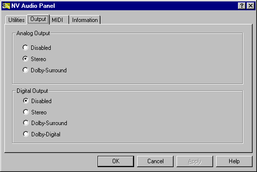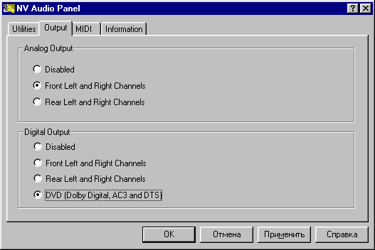 Вторая — самая важная вкладка. На ней сосредоточено управление режимами работы цифровых и аналоговых выходов. Для аналогового выхода Dolby-Surround позволяет кодировать многоканальный звук для последующего получения объёмного звука на аналоговом декодере Dolby Pro Logic. Цифровой выход может работать в режимах стерео, Dolby Pro Logic и Dolby Digital. Последнее подразумевает как кодирование на лету каналов в Dolby Digital, так и режим pass-thru для перенаправления AC3 или DTS потока на внешний декодер. Так как формат сигнала (S/PDIF) от этого не меняется, то не стоит слишком задумываться, как оно там работает — аппаратный декодер всё распознаёт по служебной информации в сигнале.