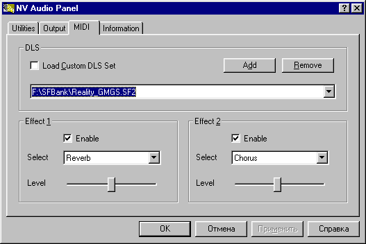 Следующая страничка посвящена MIDI. Здесь можно задать DLS или SF2 банк для MIDI-синтезатора. Я попробовал назначить 32 Мб GM/GS банк Reality, предназначенный для звуковой карты SoundBlaster Live!. Никаких проблем с воспроизведением MIDI не было. Вид и уровень MIDI эффектов задаётся чуть ниже.