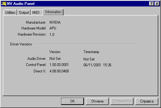 В данный момент для nForce имеются драйвера под операционные системы Windows98, Windows ME, Windows 2000 и Windows XP. Прямо перед самым выходом этой статьи они появились и официально. Для каждой из операционок, кроме Windows98, поставляется отдельный самоустанавливающийся дистрибутив. Чтобы не делать поспешных выводов, мы специально подождали драйверов для аудио v.5.10.2813, в которых должны были устраниться все недочёты. Данная версия является первой официальной версией nForce Unified Driver Package — единого комплекта драйверов для всех устройств nForce. Драйвера для ME, W2K и XP сертифицированы Microsoft WHQL.