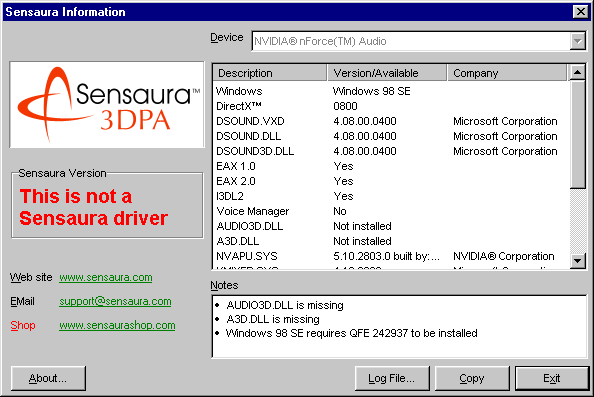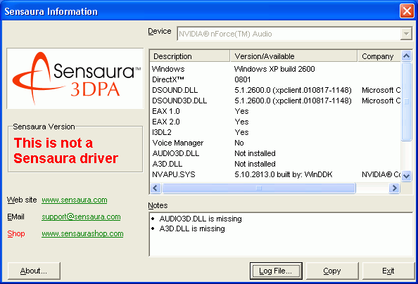 Надпись "This is not a Sensaura driver" не означает, что алгоритмы Sensaura не используются. Просто утилита не нашла в системе своих фирменных библиотек dll, через которые реализуется поддержка 3D звука для звуковых карт, основанных на технологиях Sensaura. Для nForce же структура драйверов, ввиду аппаратных особенностей, отличается от привычной, видимо отсюда утилита делает такой вывод.