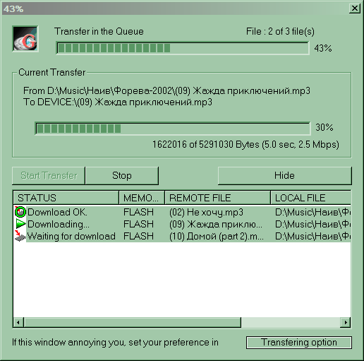 Зато файлы можно выбирать и в процессе закачки данных в память плеера. Посмотреть же статус операций и отредактировать очередь загрузки можно при помощи специального всплывающего окна (автоматическое всплывание можно вообще выключить и не думать по этому поводу).