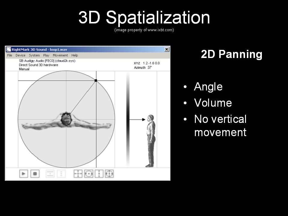 Рассмотрим, как же создается эффект 3D-звука. Начнем с простейшей технологии 2D-панорамирования. Эта технология применялась еще в DOOM от небезызвестных ID Software все просто: каждый моноисточник звука играется как стерео, а позиционирование создается за счет изменения громкости левого или правого каналов. В такой системе нет вертикального позиционирования, но возможна реализация эффектов, связанных, скажем, с небольшим изменением (фильтрацией высоких частот) звука, когда он находится сзади слушателя, так как в реальности мы слышим слегка заглушенный звук, если он находится за головой слушателя.
