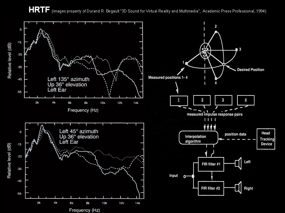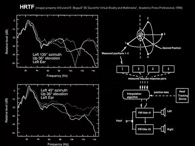 HRTF (Head Related Transfer Function) это передаточная функция, моделирующая восприятие человеком звука посредством двух ушей для определения местоположения источников в пространстве. Наши голова и туловище являются в некоторой степени препятствием, задерживающим и фильтрующим звук, поэтому ухо, скрытое от источника звука головой, воспринимает измененные звуковые сигналы, которые при "декодировании" мозгом интерпретируются соответствующим образом для правильного определения местоположения источника звука.