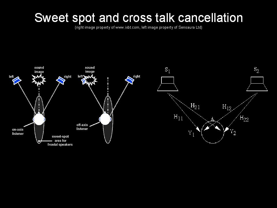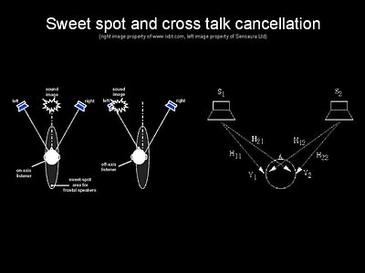 Поэтому, появилось понятие sweet spot, то есть области, при расположении внутри которой слушатель будет слышать все 3D-эффекты, которые он должен слышать. Во всех остальных случаях будут возникать искажения звука, которые будут мешать восприятию. Необходимость выбора правильного положения при прослушивании, то есть расположение слушателя в sweet spot, накладывает дополнительные ограничения и создает новые проблемы. Соответственно, что чем больше область sweet spot, тем большую свободу действий имеет слушатель. Поэтому разработчики постоянно ищут способы увеличить область действия sweet spot.