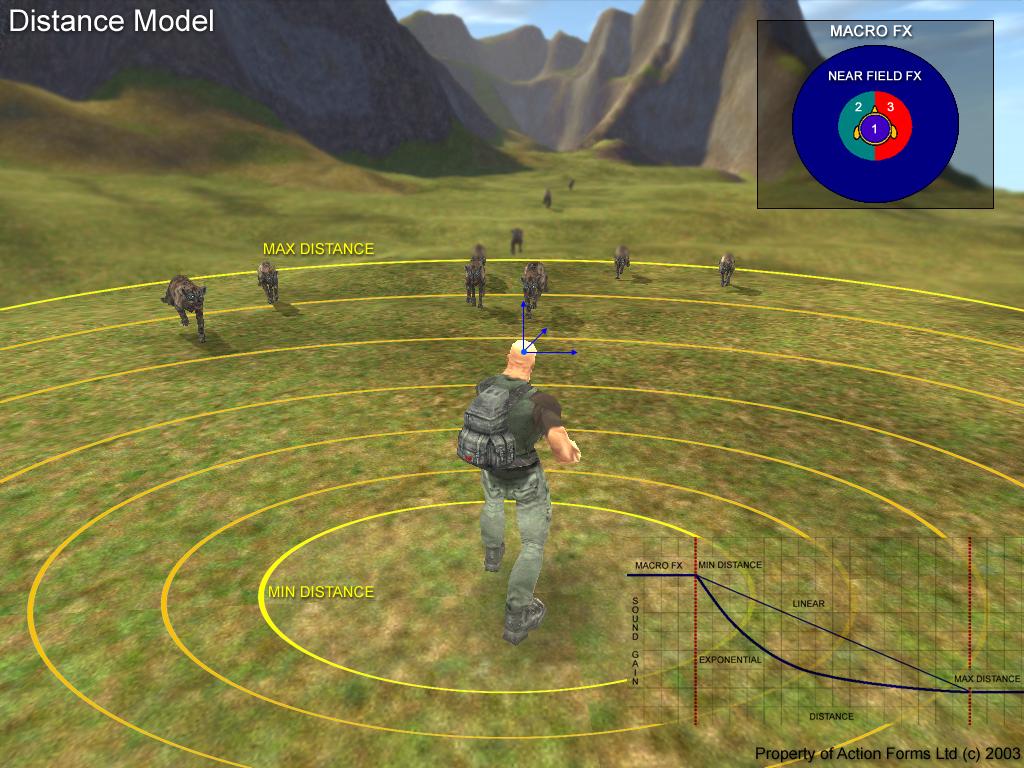 Одной из основных фич звукового движка являются дистанс-эффекты. Чем дальше источник звука удаляется от слушателя, тем тише он становиться. Рассмотрим некоторые модели, которые используются в современных системах. Об одной, самой простейшая, мы уже упоминали это просто уменьшение громкости в зависимости от расстояния: звуковой дизайнер должен задать некую относительную дистанция (Минимальную), после преодоления которой интенсивность звука начнет затухать. Пока источник находиться в переделах Минимальной дистанции, он только меняет положение, но никаких дистанс-эффектов не происходит, но после её прохождения звук теряет половину интенсивности (-6 дБ) при удалении на каждый метр от Минимальной Дистанции. Звук будет продолжать затухать, пока не достигнет определенной Maximum distance. Это означает, что звук очень далеко, чтобы быть слышимым. После достижения этого порога звук продолжает затухать до нулевой громкости, но, в принципе, такие звуки можно отключать, чтобы не занимать лишних ресурсов. Чем дальше Maximum distance, тем, соответственно, дольше источник будет слышимым.