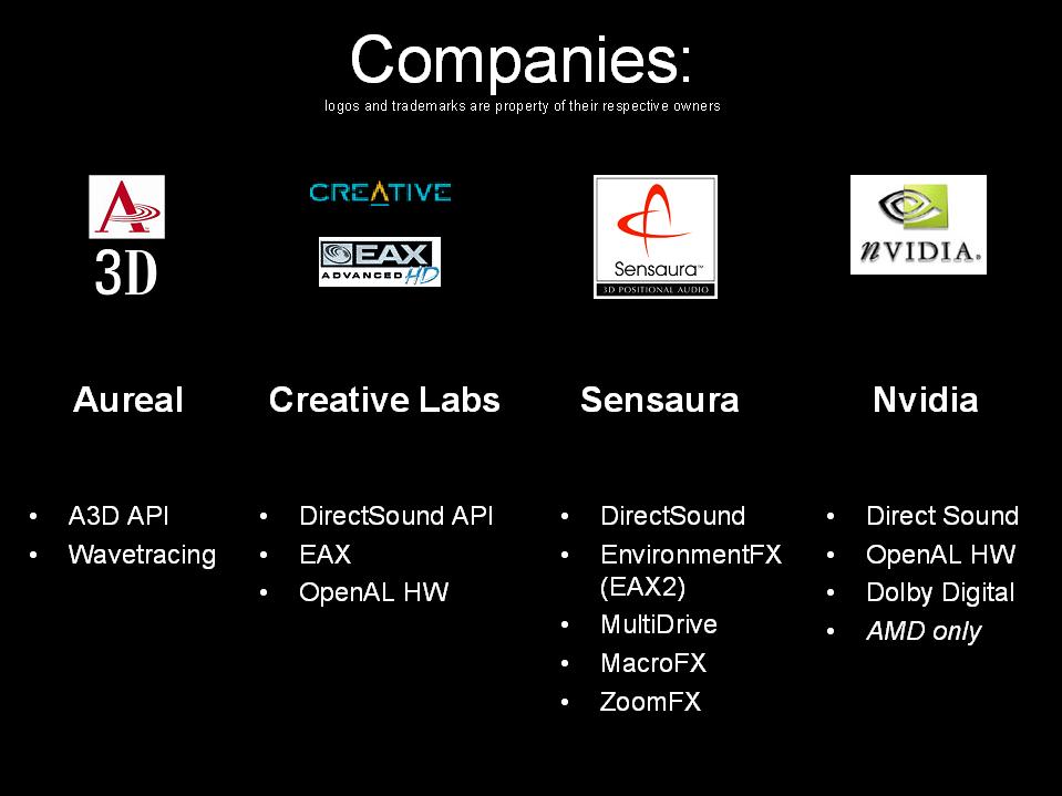 Примерно в 1997-1998 годах в каждая из фирм-производителей чипов выбрали себе технологии, за которыми, как они считали, будущее. Aureal, лидер тогдашнего рынка, пошел по пути создания максимального реализма в играх с помощью Wavetracing. Компания Creative решила, что реализма можно достичь с помощью предрасчитанных ревербераций (пресетов) и выпустила EAX. Creative купила Ensoniq / EMU в 1997, производителя и разработчика профессиональных студийных эффект процессоров поэтому технология реверберации у них уже была. Когда появилась Sensaura, они взяли за основу ЕАХ, назвали свою версию EnvironmentFX и занялись другими технологиями: MultiDrive, ZoomFX и MacroFX. Всех позже появилась компания NVIDIA (разработчик железной начинки для приставки MS X-Box), воплотившая для позиционирования 3D-звука уникальное real-time аппаратное кодирование в Dolby Digital 5.1.