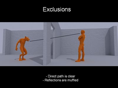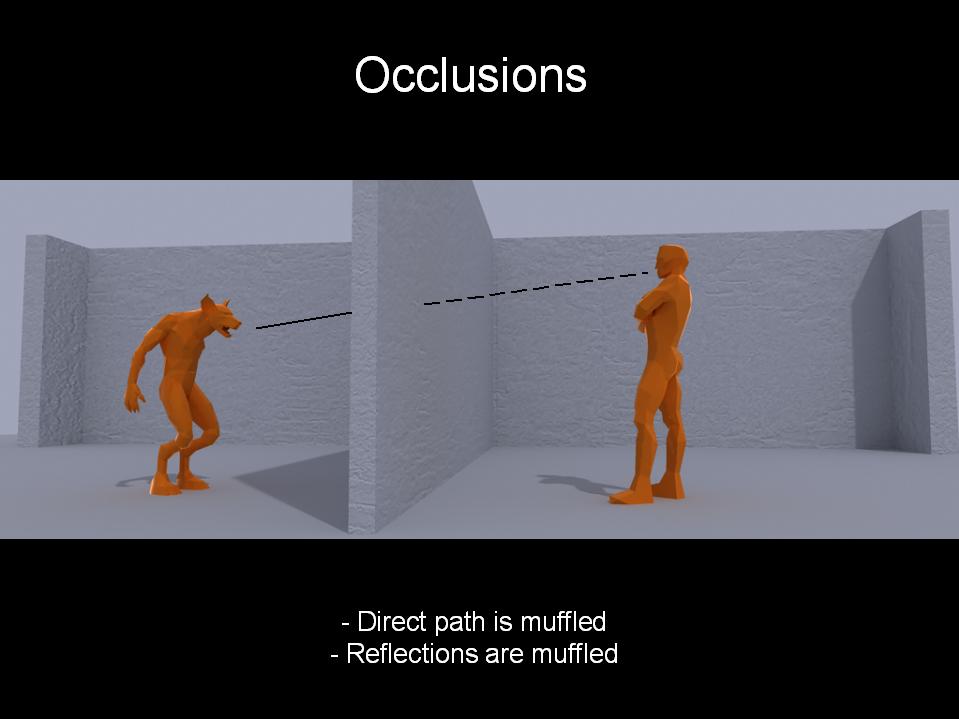 В большинстве случаев достаточно одного типа окклюзии звук находиться за «глухой» преградой. При этом, direct path составляющая звука будет заглушена и степень фильтрации определяется геометрическими параметрами (толщиной) и материалом, из которого сделана стенка. Так как прямого контакта источника и слушателя нет (они находятся в разных комнатах), то по этому же принципу заглушается эхо от источника.