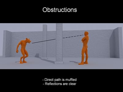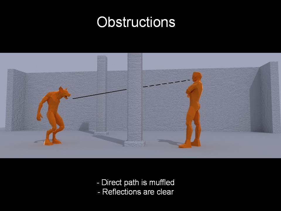 Для достижения максимальной реалистичности разработчики звукового API из Creative вводят понятие Obstruction (помеха, препятствие). В прямом переводе с английского означает практически то же самое что и Оcclusions, но с такими дополнениями: direct path составляющая заглушается прямого контакта со слушателем нет, но так как звук и источник находятся в одной комнате, поздние отражения (Late Reflections) не заглушаются и попадают к слушателю в неизменном виде.