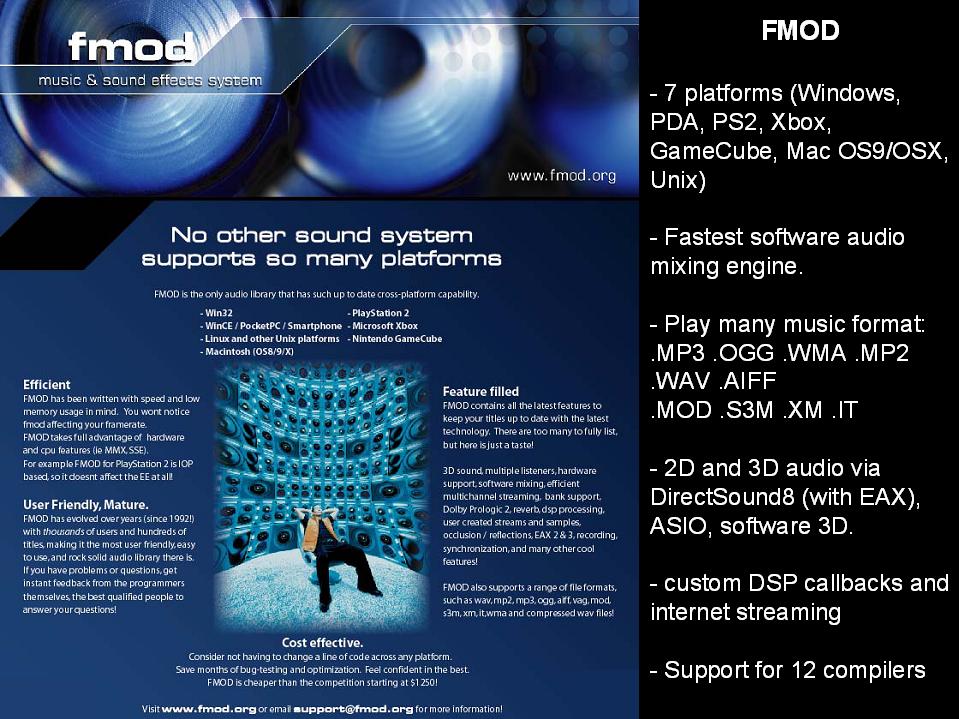 «Nice to see that a lot of the things I wanted our Engineers to develop into A3D actually got done by an outside company." David Gasior / Former Technology Evangelist at Aureal» Я особо доверяю David Gasior, и полностью согласен с его высказыванием относительно FMOD. К слову, это все не коммерческая презентация FMOD, а реальное положение вещей на рынке Audio API.