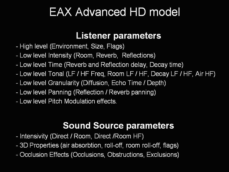 Примерно в 1997-1998 годах Creative выпускает ЕАХ версии 1. Это примитивный набор из 26 пресетов и всего 3х параметров для более точной настройки параметров Слушателя и всего 1 параметр для настройки источников. После некоторого затишья, выходит ЕАХ версия 2. Это существенный прорыв вперед и ЕАХ2 (14 параметров для настройки слушателя и 13 для источников, включая эффекты окклюзии) практически принимают как стандарт для игр. Interactive Audio Special Interest Group (www.iasig.org) создают стандарт IASIG Level 2, который практически базируется на ЕАХ2, но с некоторыми недочетами. Дело в том, что каждая компания, которая внедряет IASIG Level2 — Microsoft Direct Sound 8, Sensaura EnvironmentFX, Aureal A3D вносит свой дополнения: другой порядок расположения параметров, разные названия параметров. Это все вносит некоторые неудобства в настройку и портирования. Я не буду долго останавливаться на ЕАХ2 — это все можно прочитать в SDK на сайте developer.creative.com.