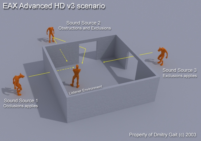 Рассмотрим следующий сценарий. 3 источника звука находятся вокруг слушателя. Источник 1 слышен в окружении (environment) слушателя с эффектом Occlusions. Источник 2 распространяется с Obstructions и Exclusions. Третий источник с Exclusions. Все параметры могут быть установлены вызовом четырёх ЕАХ3 функций — одна для установки окружения слушателя и 3 для установки эффектов Occlusions, Obstructions и Exclusions источников (дополнительные параметры устанавливается во время этих основных установок).