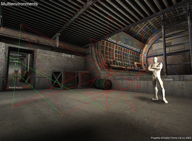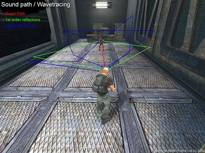 В любом случае, как бы вы не реализовывали эти эффекты (с помощью Aureal A3D, Creative Labs EAX или просто вручную на собственном звуковом движке) все равно придется трассировать геометрию (всю или только звуковую) на предмет установления прямой видимости с источником звука. А это достаточно сильный удар по производительности. Вот и получается, что почти всегда (если говорить о шутерах, 3D РПГ или любых других подобных играх, пытающихся внести максимальный реализм в звуке) надо строить упрощенную геометрию для звука. К счастью, такая геометрия строиться (почти всегда) для подсчета collision для игрока опять таки, чтобы не трассировать всю геометрию вокруг игрока в помещении. Поэтому, достаточно сделать эту же геометрию чуть более детально для звука. Конечно же, есть и другие способы, но оставим их на совести программистов игровых движков.