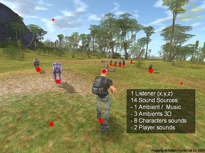 Вот типичный вид в 3D-шутере от третьего лица на примере игры Vivisector: Beast Inside (производитель Action Forms). Выделим основные элементы звуковой картины: Слушатель (Listener) и Источники звука (Sound Sources). Причем, некоторые из источников звука обычные стерео, такие как фоновая музыка (в данной конкретной игре это main ambient: ветер или трек «звуки джунглей»), 8 источников создаются игровыми персонажами-монстрами, 1 источник создает непосредственно игрок выстрел, звуки шагов и 3 случайных источника для усиления эффекта пространства (ambient sounds) в данном случае «джунгли»: звуки насекомых, птиц и т.п.
