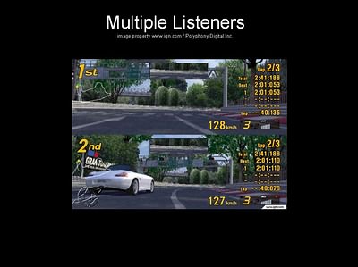 Multiple Listeners совершенно новая технология, обусловленная появлением игровых консолей (PlayStation 2, Xbox, GameCube) и игр для них с двумя или более игроками, играющими одновременно. В качестве примера Grand Turismo 3 (Polyphony Digital Inc.) на игровой TV-приставке PlayStation 2. Оба игрока играют на разных машинах, соответственно, находятся в разных частях игрового мира и по идее должны слышать только те звуки, которые их окружают. Конечно, они оба одновременно слышат звуки друг друга, но эта технология заметно упрощает реализацию. К сожалению, не один современный (аппаратный) API не поддерживает Multiple Listeners. Описываемая технология есть только в одном коммерческом звуковом API FMOD. Более подробно об этом читайте чуть ниже.