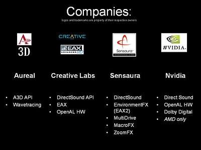 Потом, появились первые карточки с аппаратным 3D-звуком и встал вопрос о совмещения аппаратного и софтварного 3D-звука и тут началась гонка за технологиями: поддержка Aureal A3D, Creative Labs EAX 1, EAX 2, софтварный менеджер геометрии сцены для совместимости с А3D.