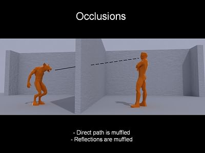 - звуки могут так же проходить сквозь объекты, такие, как вода или стены (occlusions или звук, прошедший сквозь препятствие).