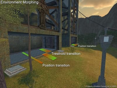 До внедрения Environments morphing, в предыдущих играх (например, в Carnivores 2), где нельзя было плавно изменять параметры (были жесткие пресеты в EAX1 и EAX2) это эмулировалось следующим образом. Создавался промежуточный environment, причем абсолютно на слух, из тех 25 пресетов, которые были доступны. Например, есть пресет пещеры (Cave) и надо сделать плавный переход в пресет Горы (Mountains). После прослушивания и изменения некоторых параметров выбирается пресет Stone Corridor, как нечто среднее. Конечно, всего этого теперь можно избежать благодаря environment morphing.