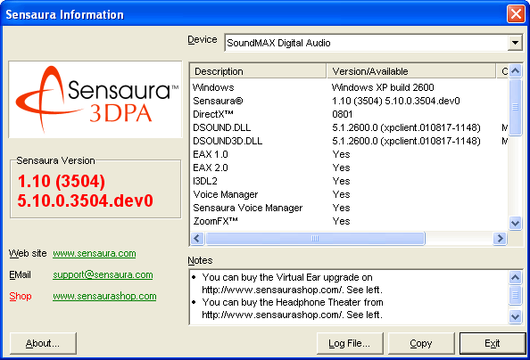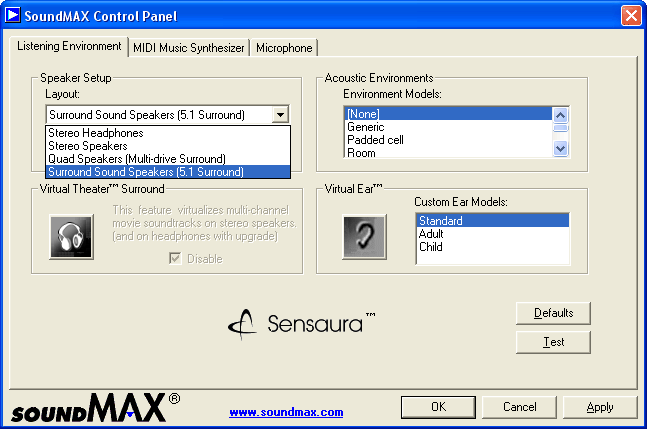 Имеются режимы для наушников, стерео-, 4-, 5.1-колоночных конфигураций. На звук можно накладывать различные эффекты моделирования сред отражения. Функция Virtual Theater 5.1 Surround позволяет получить виртуальный 5.1-звук в двух колонках. Расширенные настройки Sensaura Virtual Ear и Sensaura Headphone Theater по-прежнему доступны только в виде платных апгрейдов.