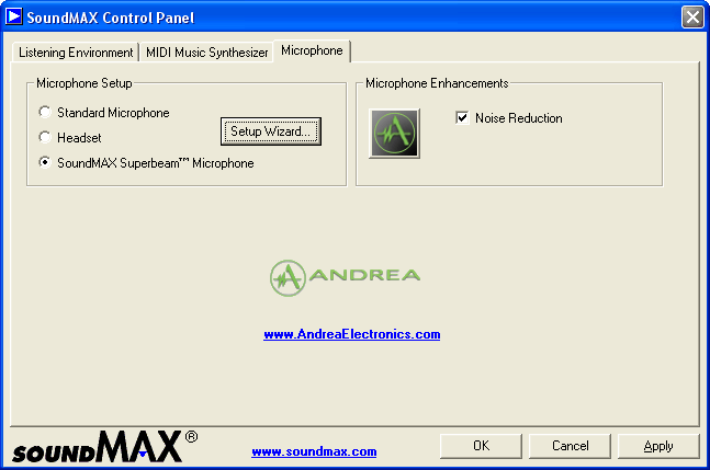 Что интересно, поддерживаются стандартные микрофоны и хедсеты. Для SoundMAX Superbeam существует отдельный Wizard, позволяющий автоматически подстроить уровень записи.