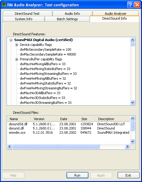 Для измерения загрузки CPU при различном числе потоков использовался тест RightMark DirectSound 1.0 alpha. Диагностика DirectSound показала наличие 32 аппаратных потока DS и DS3D. Имеется ввиду, что первые 32 голоса будут обрабатываться специальными алгоритмами Sensaura 3D. Если их будет больше  в ход пойдут программные алгоритмы от Microsoft. Необходимо понимать эту разницу.