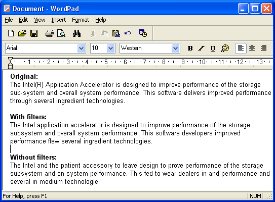 Вдохновлённый успехом, я предпринял попытку продиктовать более осмысленный текст, а заодно выяснить  насколько эффективна система фильтрации в реальном времени, которую нам предлагают. Я взял самый обычный технический текст  абзац из readme.txt к утилите Intel Application Accelerator. Диктовка велась в среднем темпе, 2-3 слова в секунду слитной речью с небольшими паузами, полагающимися по смыслу. На иллюстрации можно видеть оригинальный текст, чуть ниже  распознанный текст с включёнными фильтрами, и в конце  распознанный текст без фильтрации.