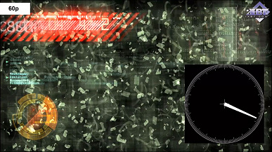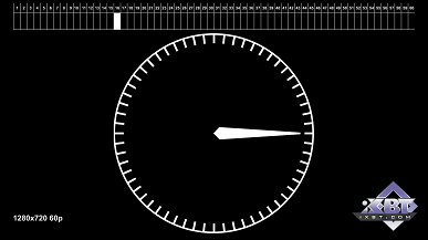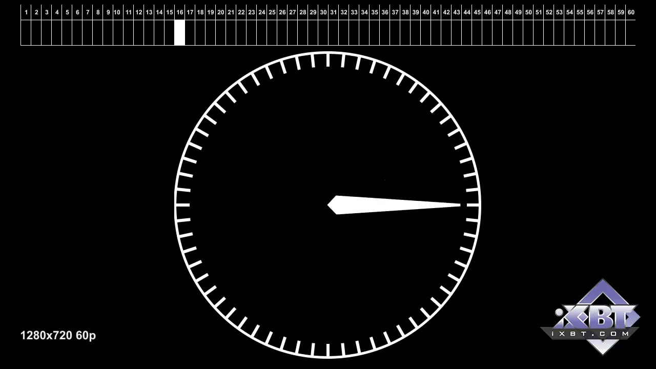 Следующий тип файлов представляет собой несложную конструкцию с циферблатом и стрелкой на нем, делающей полный оборот на 360° за одну секунду. Фотографирование экрана, на котором воспроизводится этот файл, с выдержкой ровно в 1 секунду поможет определить, все ли кадры отобразились. Если не все, то какие из них были пропущены, или демонстрировались дольше других (дублировались). Данные файлы можно использовать при тестировании любых устройств, воспроизводящих видеофайлы и имеющих собственный экран и/или видеовыход. Так, например, воспроизводится видео на одном из современных смартфонов: аппарат не справился с выводом 60 кадров в секунду, два из них пропустил (пустые области), однако, для того, чтобы выдержать положенные 60 fps, другие два кадра он продублировал (более яркие, чем соседние, области).