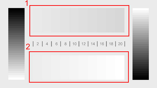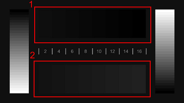 Второй тип файлов предназначен для тестирования экранов устройств, в частности, для проверки различимости градаций в тенях и светах. Для этого могут использоваться файлы с разрешениями как 1080p (black-level-1080.mp4, white-level-1080.mp4), так и 720p (black-level-720.mp4, white-level-720.mp4). Данные файлы запускаются в видеоплеере, воспроизведение приостанавливается, после чего нужно внимательно рассмотреть зоны 1 и 2. Они выделены на следующих примерах:
