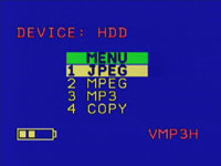 Работает плеер от входящего в комплект блока питания или от встроенного аккумулятора, которого хватает максимум на 2.5 часа работы. После включения плеера, если вставлены карты флэш-памяти, плеер предложит выбрать, с каким носителем предстоит работать. Если же карт нет, вы попадаете сразу на жесткий диск. Поторопитесь, так как через некоторое время, которое не поддается регулировке, устройство впадет в спячку (при которой перестает что-либо отображаться на дисплее, но, что удивительно, подсветка дисплея продолжает исправно работать). Первое ведро гвоздей создателю.