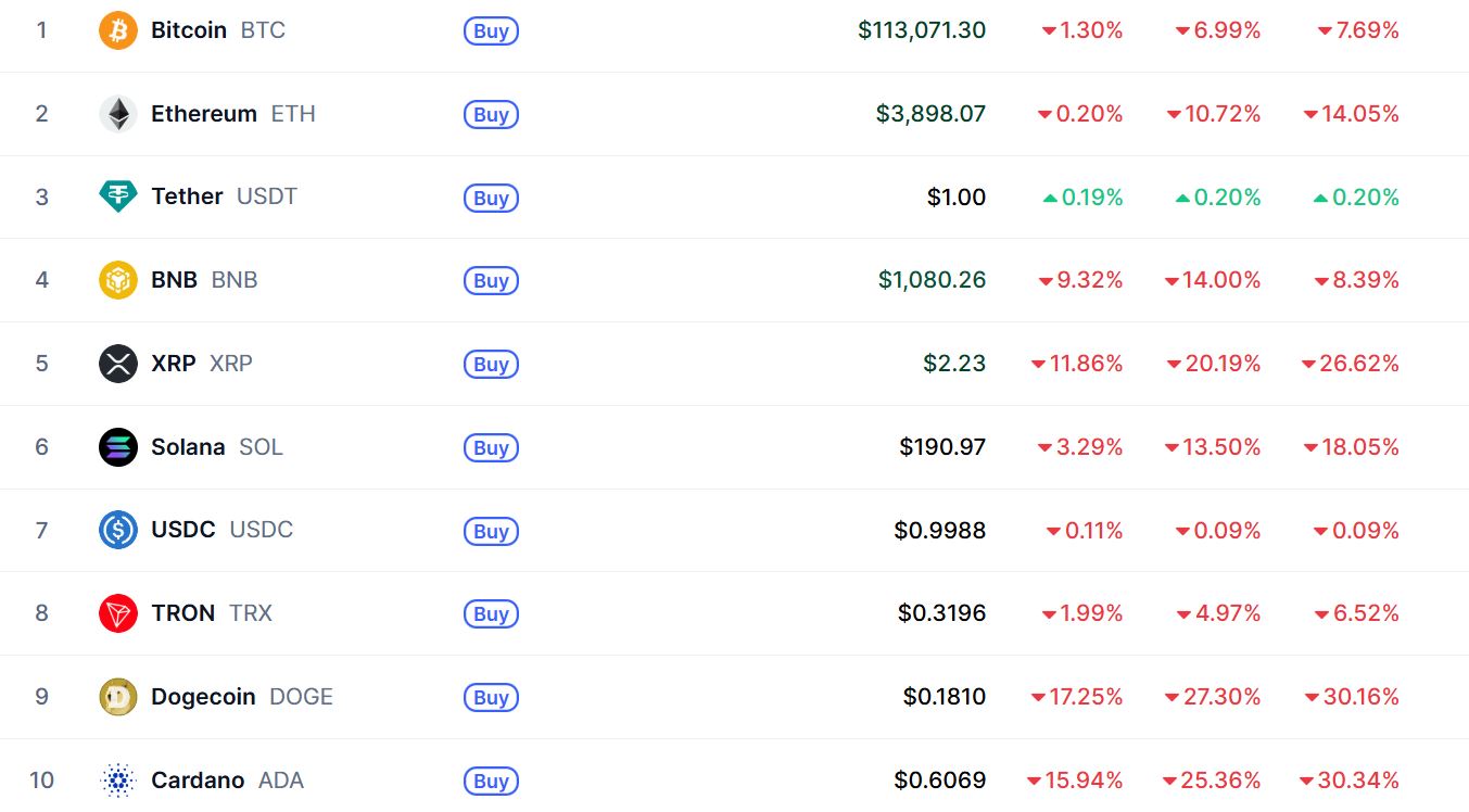 В топ-10 больше всего просели XRP, Dogecoin и Cardano — падение от 26% до 30%. Что касается Ethereum, то цена снизилась примерно на 10% — цена ушла ниже отметки в 4000 долларов. В целом крипторынок просел более чем на 9% — до 3,76 триллиона долларов.