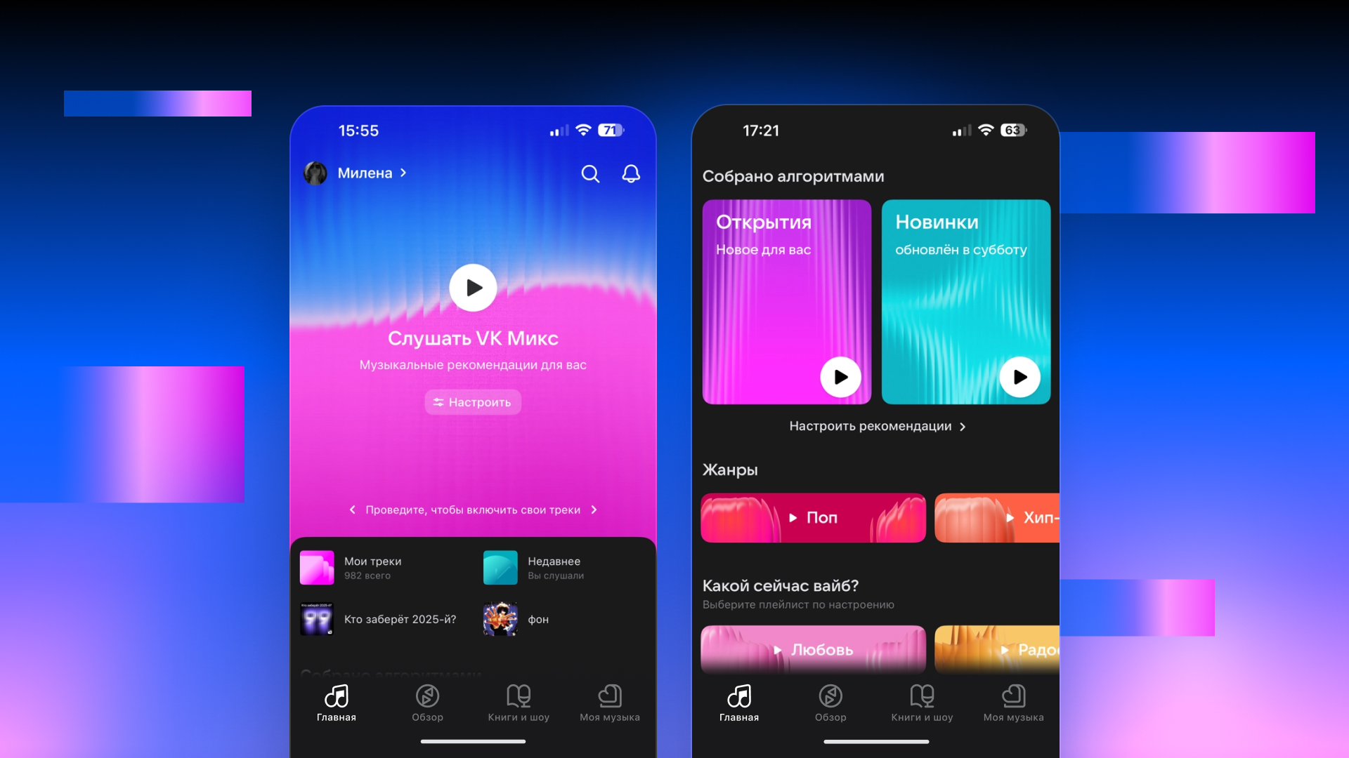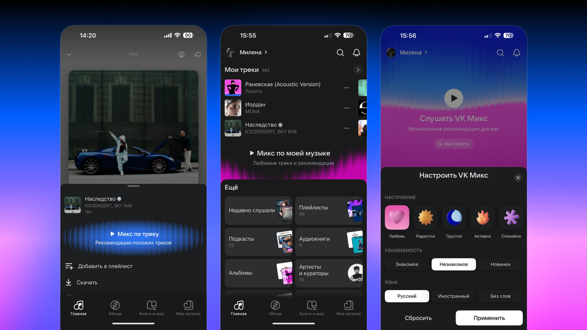 В разделе «Моя музыка» появилась настройка «Микс по моей музыке» — смесь треков из коллекции пользователей с добавлением рекомендаций. Также в «VK Микс» появились «мультинастройки». Теперь пользователь может одновременно выбрать несколько характеристик для настройки рекомендаций, например «Радостно», «Новинки» и музыка без слов.