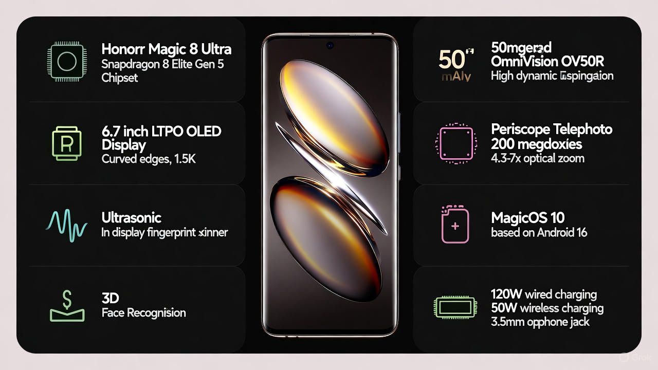 Honor Magic 8 Ultra будет оснащён однокристальной системой Snapdragon 8 Elite Gen 5, о чем сообщил Digital Chat Station. Смартфон будет оснащён 6,7-дюймовым OLED-дисплеем LTPO с изогнутым по краям дизайном. Разрешение экрана составит 1,5K, он будет оснащён ультразвуковым сканером отпечатков пальцев, встроенным в экран. Смартфон также будет поддерживать 3D-распознавание лиц.