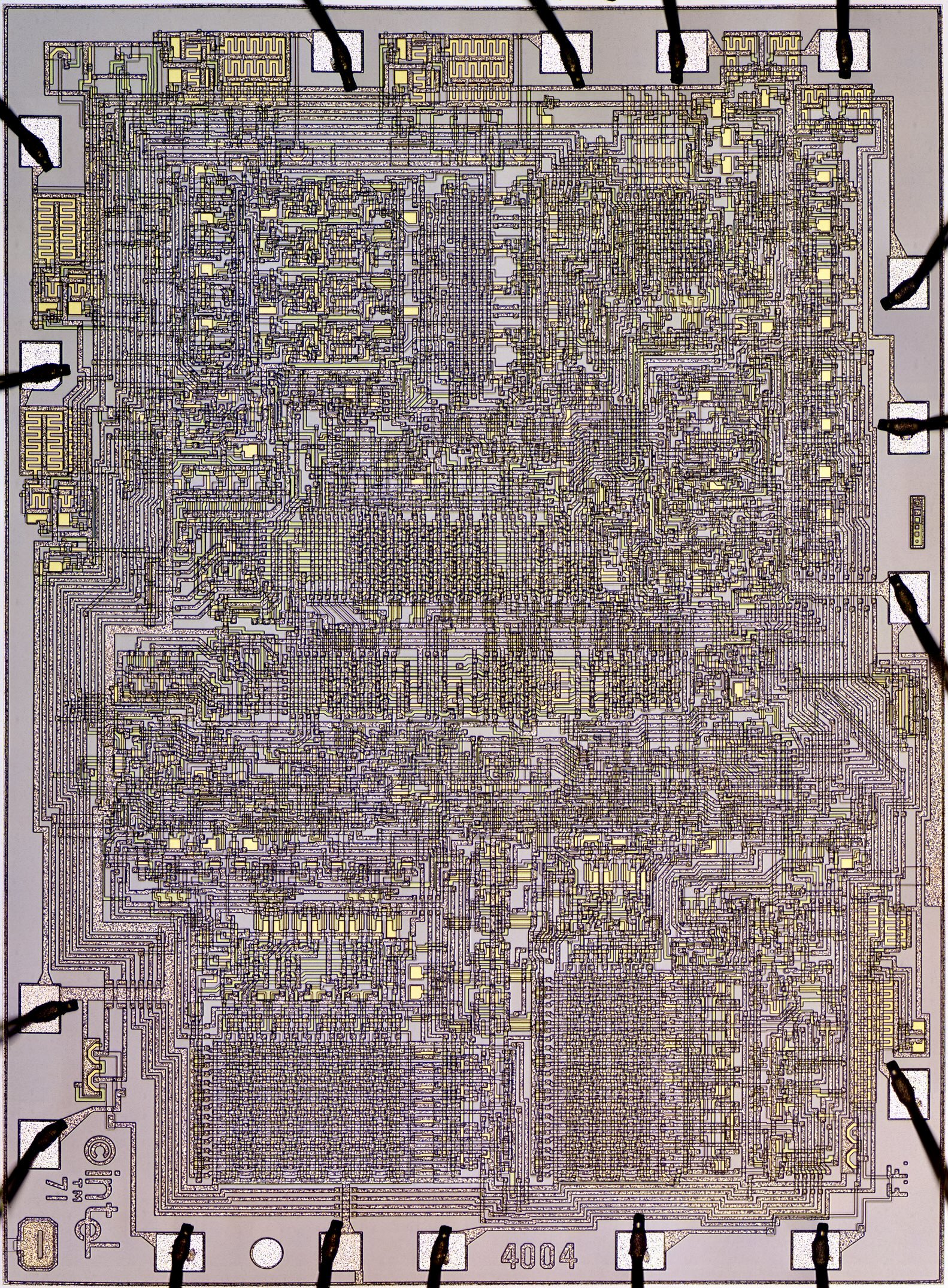 На сей раз под нож попал Intel 4004, вышедший за год до 8008 - в 1971 году. Это по-настоящему легендарный CPU, который считается первым в мире коммерчески доступным однокристальным микропроцессором.