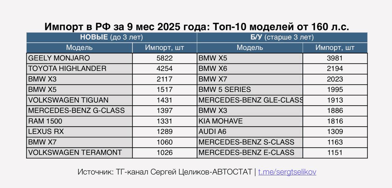 По данным за девять месяцев этого года, россияне ввезли почти 100 тысяч машин мощнее 160 л.с., включая 42,2 тысячи новых и 54,4 тысячи подержанных. Среди новых лидирует Geely Monjaro — её владельцам можно не беспокоиться: модель официально представлена в стране, пусть и по более высокой цене.