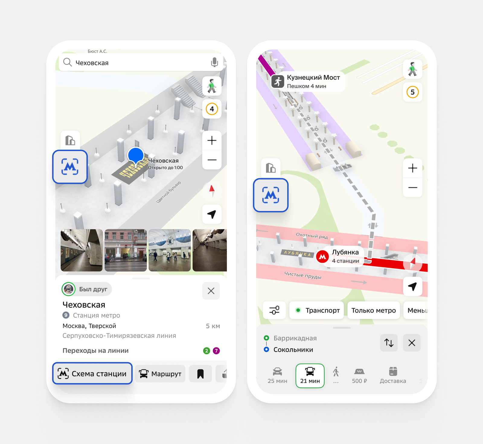 Посмотреть схемы можно, нажав на кнопку «Схема станции» в карточке станции или входа в метро, для которой есть схема. В 2ГИС можно посмотреть весь путь в метро — от входа, через эскалаторы и переходы между станциями, до выхода. На карте появились детальные планы с турникетами, кассами, зарядными станциями для телефонов, банкоматами, можно увидеть люстры, колонны и даже модели поездов, которые приходят на станцию. Кроме этого, в слое метро можно посмотреть схематичные очертания подземных частей станций для всех станций в Москве.