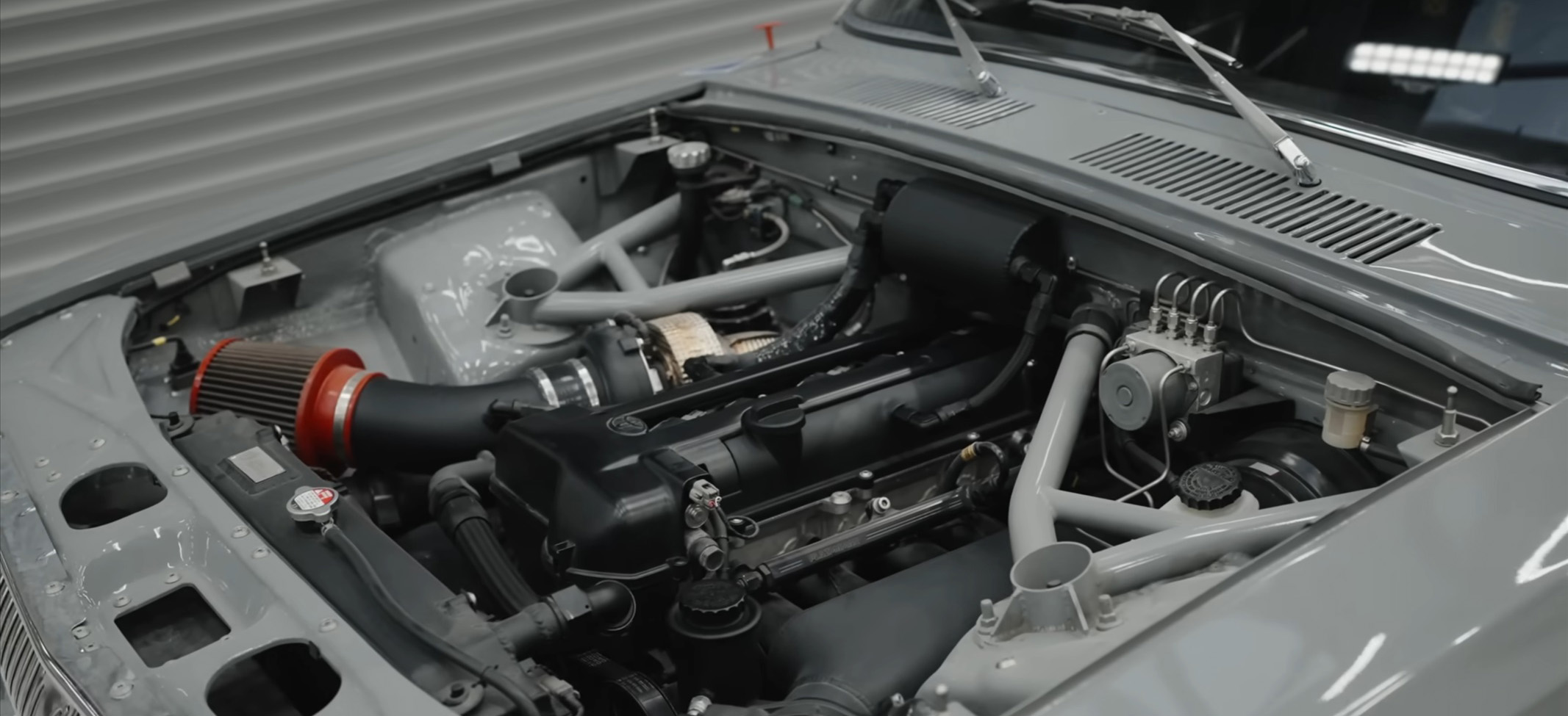 Родной двигатель объёмом 2,5 литра и мощностью 95 л.с. заменили на легендарный Toyota 2JZ-GTE. Мотор получил кованые шатуны и поршни, усиленные форсунки и турбину Garrett 30/76 gen2, что позволило увеличить мощность до 700 л.с. По словам владельца, при необходимости отдачу можно регулировать в пределах от 450 до 700 л.с., просто выбирая один из 6 переключателей.