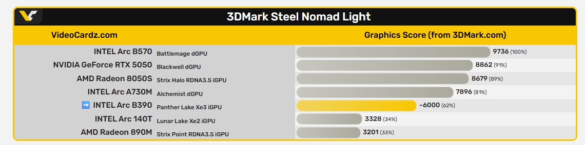 Графическое ядро Arc B390, которое будет в топовых мобильных процессорах Intel Core Ultra 300, засветилось в 3DMark, где показало очень достойные результаты. Точнее, об этом написал инсайдер OneRaichu.