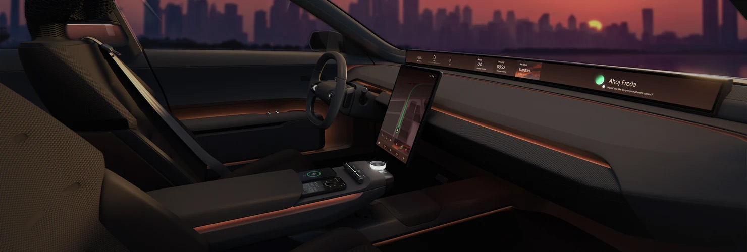Если экстерьер экстравагантный, то интерьер Vision O выглядит вполне буднично, особенно на фоне современных электромобилей и гибридов из Китая. На передней панели установили тонкий и длинный экран, а по центру установлен большой экран медиасистемы.