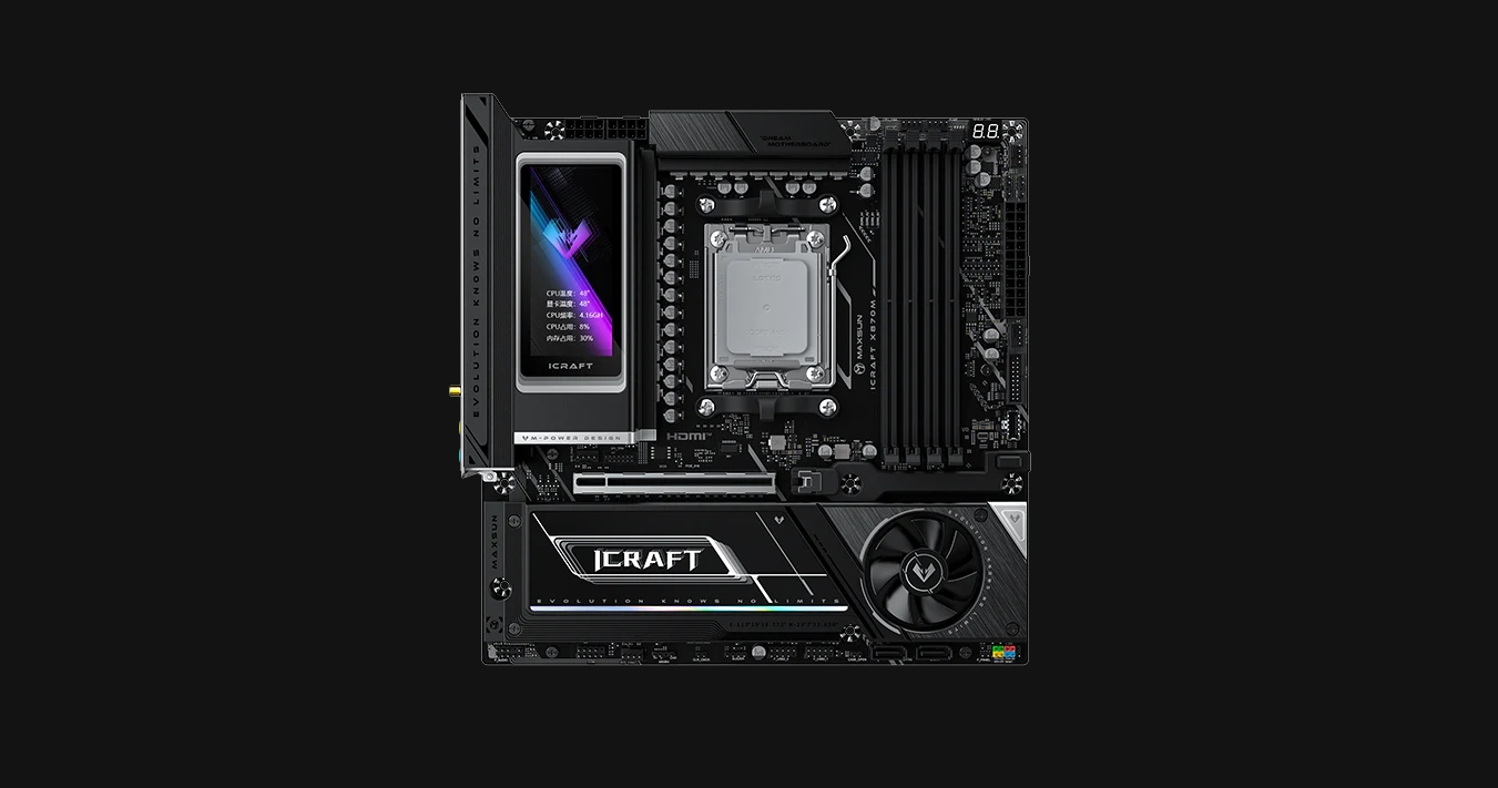 Компания Maxsun представила флагманскую системную плату iCraft X870M, которая может похвастаться и собственным весьма крупным экраном, и активной системой охлаждения, и заодно стилем «тотал блэк».