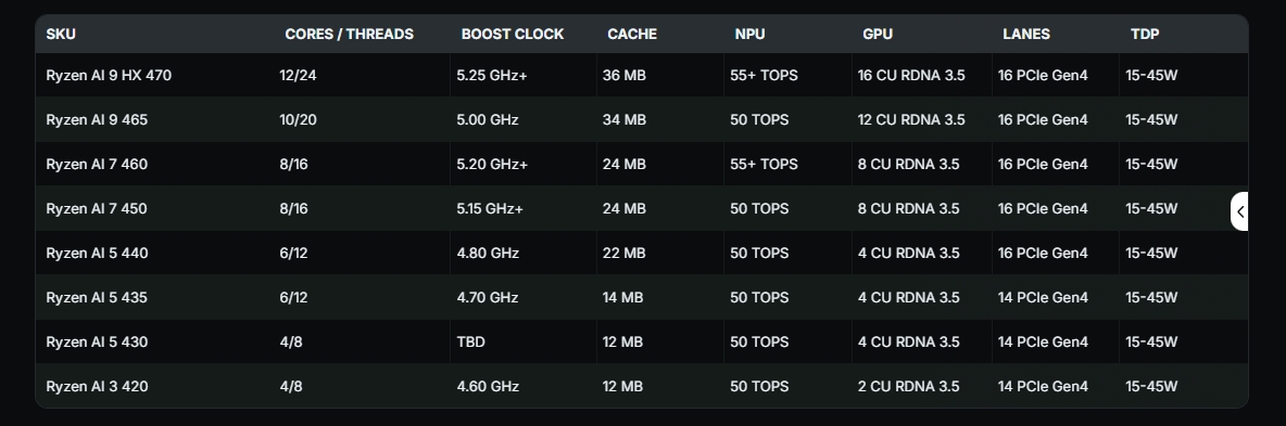 Судя по всему, практически никаких отличий от текущих Ryzen AI 300 не будет. Возможно, у каких-то отдельных моделей что-то и будет отличаться, но в целом это просто те же CPU с повышенными частотами и новыми именами. Даже NPU по большей части останется с той же производительностью в 50 TOPS, хотя две модели смогут предложить 55 TOPS.
