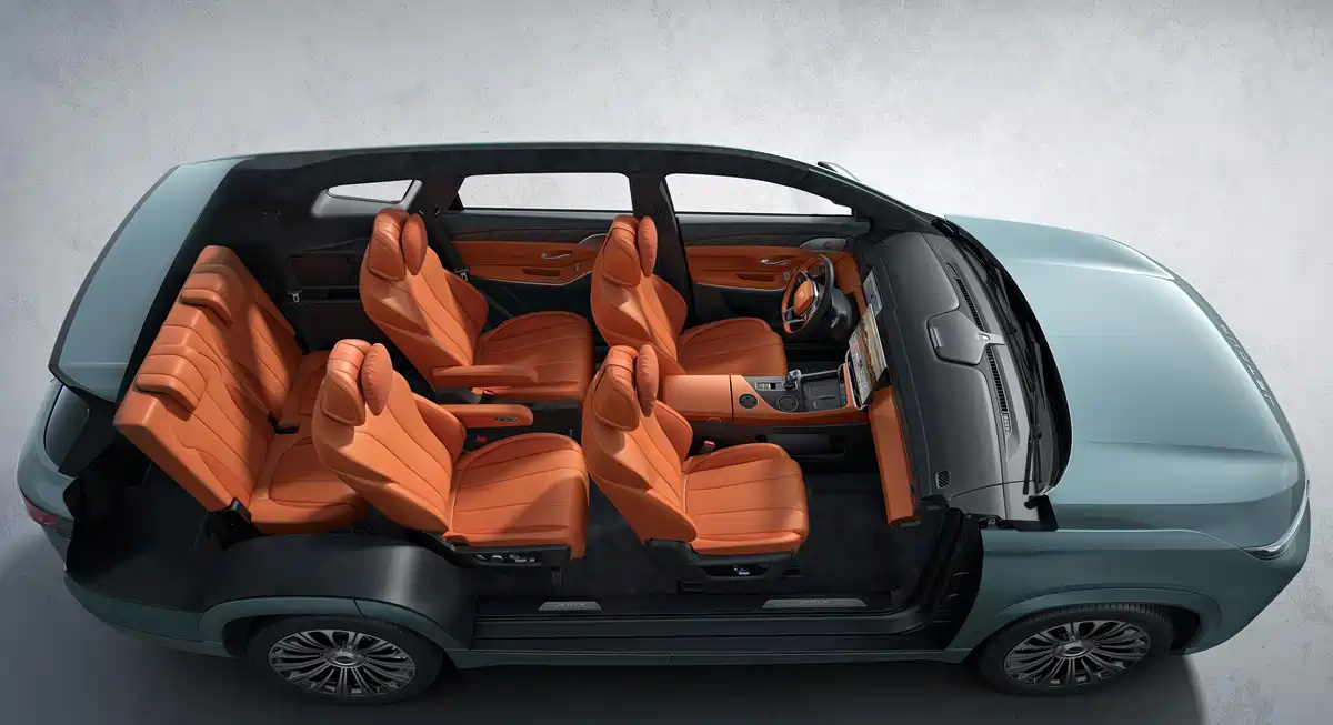 В салоне установлены экраны с диагональю 10,25 и 15,6 дюйма, медиасистема работает под управлением Qualcomm Snapdragon 8155. Автомобиль получил телематическую систему, «хрустальный» селектор передач, алькантару на потолке, комфортные кресла с вентиляцией, подогревом и функцией массажа (на первых двух рядах).